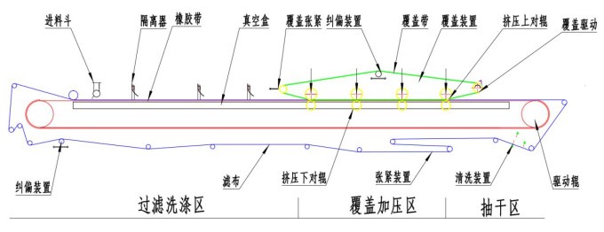 3、洗滌:洗滌液經(jīng)過分配軟管進(jìn)入料漿腔后完全覆蓋在濾餅上,在壓力作用下穿過濾餅和濾布后排出。